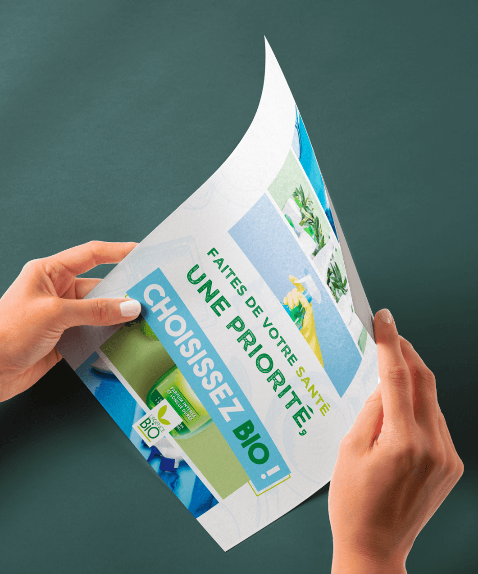 J’ai alors voulu reconquérir la clientèle à l’aide de couleurs dynamiques. La réalisation de chaque affiche se base sur deux teintes de couleurs (vert et une autre couleur déterminée en lien avec le secteur). Nous avons donc une affiche par secteur en question (alimentation, cosmétique, produit ménager), afin de créer une série facilement reconnaissable auprès du consommateur.
